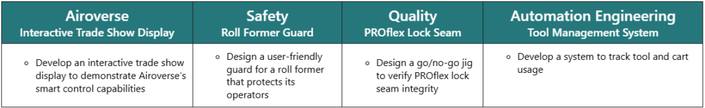 From January–March, eight students worked with DMI teams across our Safety, Quality, and Automation Engineering Departments, and Airoverse business unit. Over the course of eight weeks, the students met to research problems, collaborate with DMI team members, and develop proposed solutions.